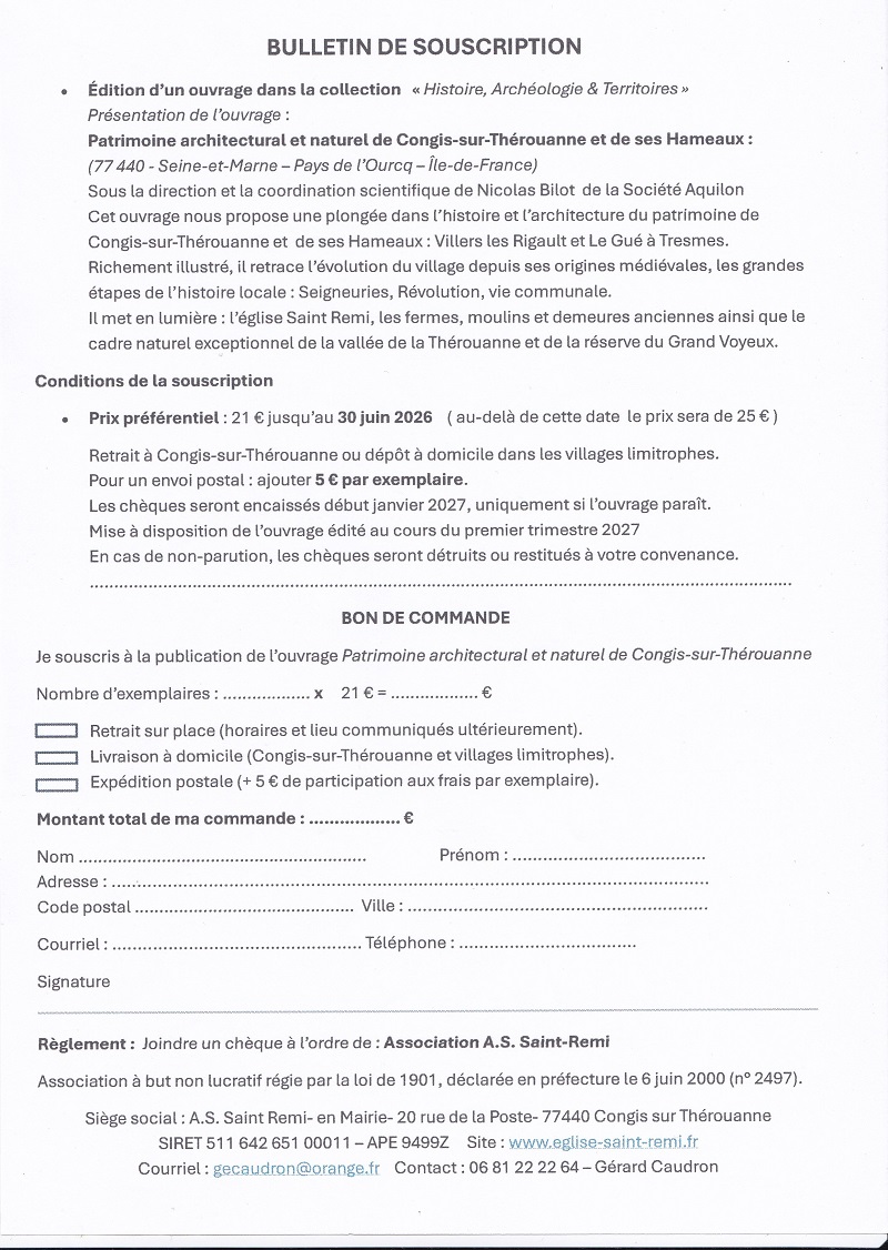 Appel à souscription pour un ouvrage de la collection" Histoire,Archéologie&Territoire" Sur le Patrimoine de Congis sur Thérouanne 77440